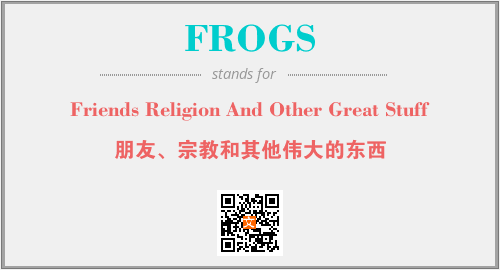上述内容是“Friends Religion And Other Great Stuff”作为“FROGS”的缩写,解释为“朋友、宗教和其他伟大的东西”时的信息,以及英文缩略词FROGS所代表的英文单词,其对应的中文拼音、详细解释以及在英文中的流行度和相关分类、应用领域及应用示例等。