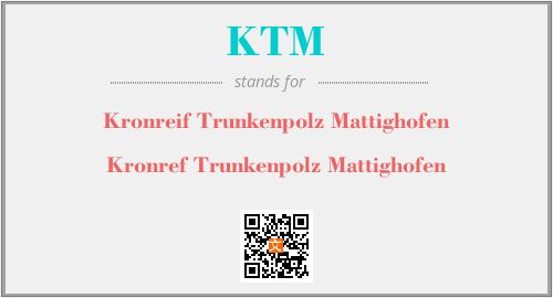 英文缩略词“KTM”经常作为“Kronreif Trunkenpolz Mattighofen”的英文缩写来使用,中文表示:“Kronref Trunkenpolz Mattighofen”。本文将详细介绍英文缩写词KTM所代表英文单词,其对应的中文拼音、详细解释以及在英语中的流行度。此外,还有关于缩略词KTM的分类、应用领域及相关应用示例等。