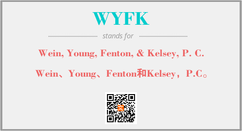 上述内容是“Wein, Young, Fenton, & Kelsey, P. C.”作为“WYFK”的缩写,解释为“Wein、Young、Fenton和Kelsey,P.C。”时的信息,以及英文缩略词WYFK所代表的英文单词,其对应的中文拼音、详细解释以及在英文中的流行度和相关分类、应用领域及应用示例等。