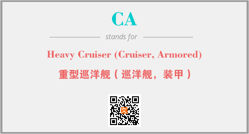 英文缩略词“CA”经常作为“Heavy Cruiser (Cruiser, Armored)”的英文缩写来使用,中文表示:“重型巡洋舰(巡洋舰,装甲)”。本文将详细介绍英文缩写词CA所代表英文单词,其对应的中文拼音、详细解释以及在英语中的流行度。此外,还有关于缩略词CA的分类、应用领域及相关应用示例等。