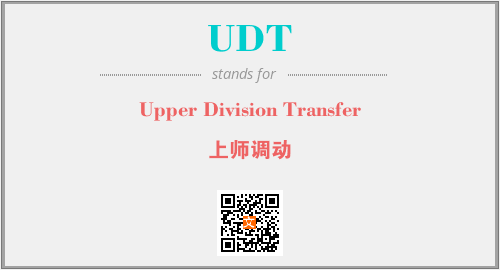 英文缩略词“UDT”经常作为“Upper Division Transfer”的英文缩写来使用,中文表示:“上师调动”。本文将详细介绍英文缩写词UDT所代表英文单词,其对应的中文拼音、详细解释以及在英语中的流行度。此外,还有关于缩略词UDT的分类、应用领域及相关应用示例等。