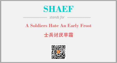 上述内容是“A Soldiers Hate An Early Frost”作为“SHAEF”的缩写,解释为“士兵讨厌早霜”时的信息,以及英文缩略词SHAEF所代表的英文单词,其对应的中文拼音、详细解释以及在英文中的流行度和相关分类、应用领域及应用示例等。