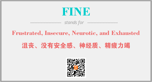 上述内容是“Frustrated, Insecure, Neurotic, and Exhausted”作为“FINE”的缩写,解释为“沮丧、没有安全感、神经质、精疲力竭”时的信息,以及英文缩略词FINE所代表的英文单词,其对应的中文拼音、详细解释以及在英文中的流行度和相关分类、应用领域及应用示例等。