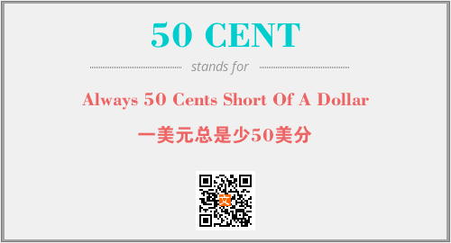 以上为Always 50 Cents Short Of A Dollar英文缩略词50 CENT的中文解释,以及该英文缩写在英语的流行度、分类和应用领域方面的信息。