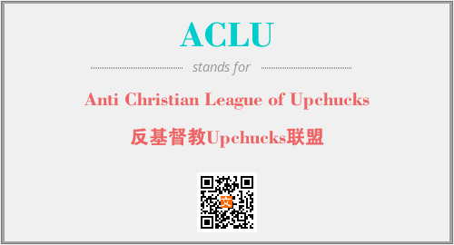 上述内容是“Anti Christian League of Upchucks”作为“ACLU”的缩写,解释为“反基督教Upchucks联盟”时的信息,以及英文缩略词ACLU所代表的英文单词,其对应的中文拼音、详细解释以及在英文中的流行度和相关分类、应用领域及应用示例等。