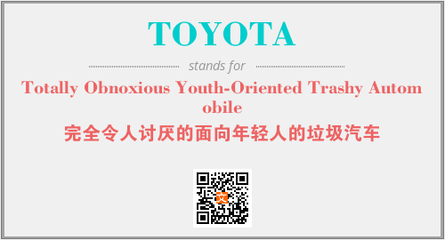 上述内容是“Totally Obnoxious Youth-Oriented Trashy Automobile”作为“TOYOTA”的缩写,解释为“完全令人讨厌的面向年轻人的垃圾汽车”时的信息,以及英文缩略词TOYOTA所代表的英文单词,其对应的中文拼音、详细解释以及在英文中的流行度和相关分类、应用领域及应用示例等。