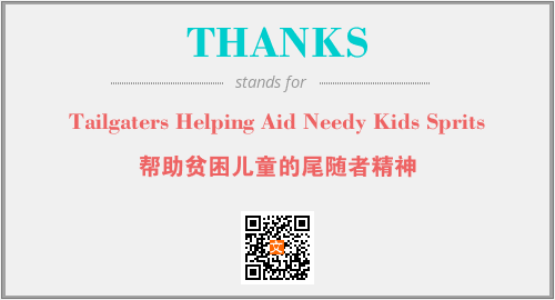 上述内容是“Tailgaters Helping Aid Needy Kids Sprits”作为“THANKS”的缩写,解释为“帮助贫困儿童的尾随者精神”时的信息,以及英文缩略词THANKS所代表的英文单词,其对应的中文拼音、详细解释以及在英文中的流行度和相关分类、应用领域及应用示例等。