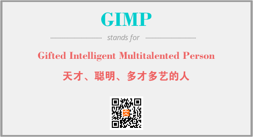 上述内容是“Gifted Intelligent Multitalented Person”作为“GIMP”的缩写,解释为“天才、聪明、多才多艺的人”时的信息,以及英文缩略词GIMP所代表的英文单词,其对应的中文拼音、详细解释以及在英文中的流行度和相关分类、应用领域及应用示例等。