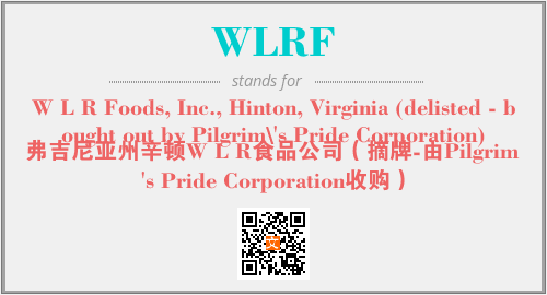 上述内容是“W L R Foods, Inc., Hinton, Virginia (delisted - bought out by Pilgrim\'s Pride Corporation)”作为“WLRF”的缩写,解释为“弗吉尼亚州辛顿W L R食品公司(摘牌-由Pilgrim's Pride Corporation收购)”时的信息,以及英文缩略词WLRF所代表的英文单词,其对应的中文拼音、详细解释以及在英文中的流行度和相关分类、应用领域及应用示例等。