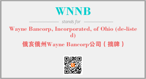 上述内容是“Wayne Bancorp, Incorporated, of Ohio (de-listed)”作为“WNNB”的缩写,解释为“俄亥俄州Wayne Bancorp公司(摘牌)”时的信息,以及英文缩略词WNNB所代表的英文单词,其对应的中文拼音、详细解释以及在英文中的流行度和相关分类、应用领域及应用示例等。