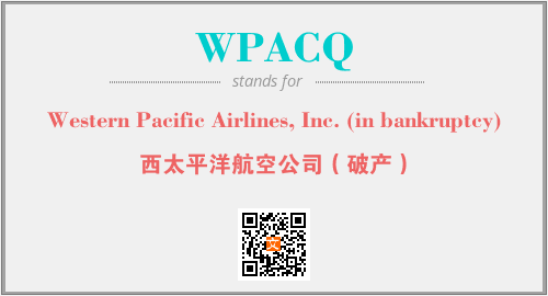 上述内容是“Western Pacific Airlines, Inc. (in bankruptcy)”作为“WPACQ”的缩写,解释为“西太平洋航空公司(破产)”时的信息,以及英文缩略词WPACQ所代表的英文单词,其对应的中文拼音、详细解释以及在英文中的流行度和相关分类、应用领域及应用示例等。