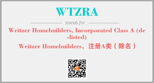 上述内容是“Weitzer Homebuilders, Incorporated Class A (de-listed)”作为“WTZRA”的缩写,解释为“Weitzer Homebuilders,注册A类(除名)”时的信息,以及英文缩略词WTZRA所代表的英文单词,其对应的中文拼音、详细解释以及在英文中的流行度和相关分类、应用领域及应用示例等。