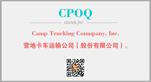 上述内容是“Camp Trucking Comnpany, Inc.”作为“CPOQ”的缩写,解释为“营地卡车运输公司(股份有限公司)。”时的信息,以及英文缩略词CPOQ所代表的英文单词,其对应的中文拼音、详细解释以及在英文中的流行度和相关分类、应用领域及应用示例等。