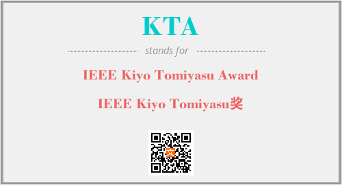 上述内容是“IEEE Kiyo Tomiyasu Award”作为“KTA”的缩写,解释为“IEEE Kiyo Tomiyasu奖”时的信息,以及英文缩略词KTA所代表的英文单词,其对应的中文拼音、详细解释以及在英文中的流行度和相关分类、应用领域及应用示例等。