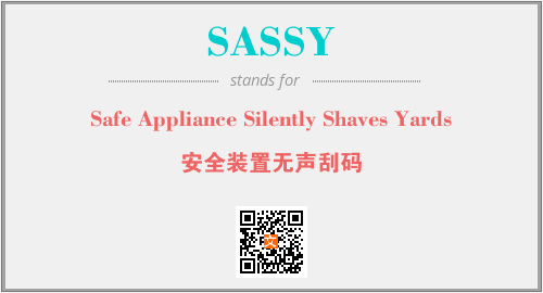 上述内容是“Safe Appliance Silently Shaves Yards”作为“SASSY”的缩写,解释为“安全装置无声刮码”时的信息,以及英文缩略词SASSY所代表的英文单词,其对应的中文拼音、详细解释以及在英文中的流行度和相关分类、应用领域及应用示例等。