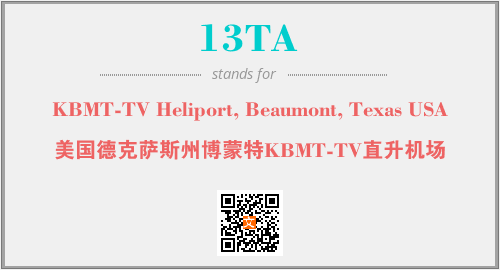 上述内容是“KBMT-TV Heliport, Beaumont, Texas USA”作为“13TA”的缩写,解释为“美国德克萨斯州博蒙特KBMT-TV直升机场”时的信息,以及英文缩略词13TA所代表的英文单词,其对应的中文拼音、详细解释以及在英文中的流行度和相关分类、应用领域及应用示例等。