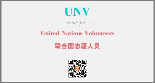 上述内容是“United Nations Volunteers”作为“UNV”的缩写,解释为“联合国志愿人员”时的信息,以及英文缩略词UNV所代表的英文单词,其对应的中文拼音、详细解释以及在英文中的流行度和相关分类、应用领域及应用示例等。