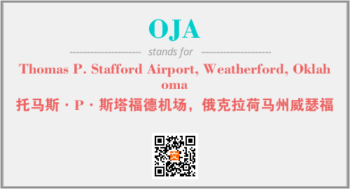 上述内容是“Thomas P. Stafford Airport, Weatherford, Oklahoma”作为“OJA”的缩写,解释为“托马斯·P·斯塔福德机场,俄克拉荷马州威瑟福”时的信息,以及英文缩略词OJA所代表的英文单词,其对应的中文拼音、详细解释以及在英文中的流行度和相关分类、应用领域及应用示例等。