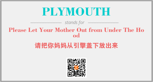 以上为Please Let Your Mother Out from Under The Hood英文缩略词PLYMOUTH的中文解释,以及该英文缩写在英语的流行度、分类和应用领域方面的信息。
