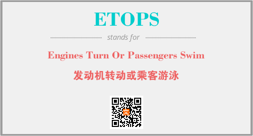 上述内容是“Engines Turn Or Passengers Swim”作为“ETOPS”的缩写,解释为“发动机转动或乘客游泳”时的信息,以及英文缩略词ETOPS所代表的英文单词,其对应的中文拼音、详细解释以及在英文中的流行度和相关分类、应用领域及应用示例等。