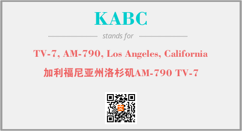 上述内容是“TV-7, AM-790, Los Angeles, California”作为“KABC”的缩写,解释为“加利福尼亚州洛杉矶AM-790 TV-7”时的信息,以及英文缩略词KABC所代表的英文单词,其对应的中文拼音、详细解释以及在英文中的流行度和相关分类、应用领域及应用示例等。