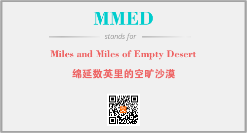 英文缩略词“MMED”经常作为“Miles and Miles of Empty Desert”的英文缩写来使用,中文表示:“绵延数英里的空旷沙漠”。本文将详细介绍英文缩写词MMED所代表英文单词,其对应的中文拼音、详细解释以及在英语中的流行度。此外,还有关于缩略词MMED的分类、应用领域及相关应用示例等。