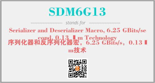 上述内容是“Serializer and Deserializer Macro, 6.25 GBits/second, 0.13 µm Technology”作为“SDM6G13”的缩写,解释为“序列化器和反序列化器宏,6.25 GBits/s,0.13µm技术”时的信息,以及英文缩略词SDM6G13所代表的英文单词,其对应的中文拼音、详细解释以及在英文中的流行度和相关分类、应用领域及应用示例等。