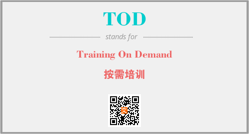 英文缩略词“TOD”经常作为“Training On Demand”的英文缩写来使用,中文表示:“按需培训”。本文将详细介绍英文缩写词TOD所代表英文单词,其对应的中文拼音、详细解释以及在英语中的流行度。此外,还有关于缩略词TOD的分类、应用领域及相关应用示例等。