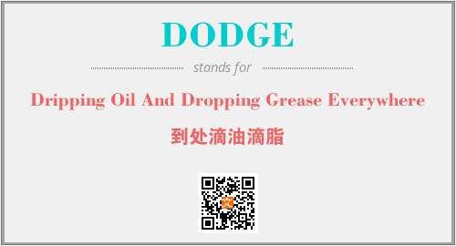 上述内容是“Dripping Oil And Dropping Grease Everywhere”作为“DODGE”的缩写,解释为“到处滴油滴脂”时的信息,以及英文缩略词DODGE所代表的英文单词,其对应的中文拼音、详细解释以及在英文中的流行度和相关分类、应用领域及应用示例等。