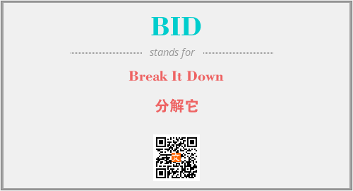 上述内容是“Break It Down”作为“BID”的缩写,解释为“分解它”时的信息,以及英文缩略词BID所代表的英文单词,其对应的中文拼音、详细解释以及在英文中的流行度和相关分类、应用领域及应用示例等。