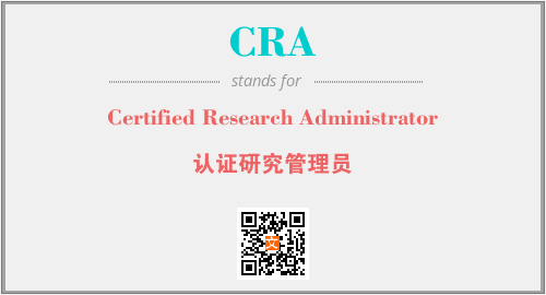 英文缩略词“CRA”经常作为“Certified Research Administrator”的英文缩写来使用,中文表示:“认证研究管理员”。本文将详细介绍英文缩写词CRA所代表英文单词,其对应的中文拼音、详细解释以及在英语中的流行度。此外,还有关于缩略词CRA的分类、应用领域及相关应用示例等。