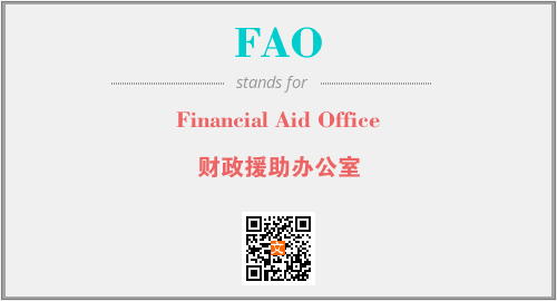 英文缩略词“FAO”经常作为“Financial Aid Office”的英文缩写来使用,中文表示:“财政援助办公室”。本文将详细介绍英文缩写词FAO所代表英文单词,其对应的中文拼音、详细解释以及在英语中的流行度。此外,还有关于缩略词FAO的分类、应用领域及相关应用示例等。