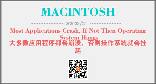 上述内容是“Most Applications Crash, If Not Then Operating System Hangs”作为“MACINTOSH”的缩写,解释为“大多数应用程序都会崩溃,否则操作系统就会挂起”时的信息,以及英文缩略词MACINTOSH所代表的英文单词,其对应的中文拼音、详细解释以及在英文中的流行度和相关分类、应用领域及应用示例等。