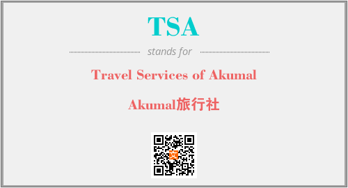 上述内容是“Travel Services of Akumal”作为“TSA”的缩写,解释为“Akumal旅行社”时的信息,以及英文缩略词TSA所代表的英文单词,其对应的中文拼音、详细解释以及在英文中的流行度和相关分类、应用领域及应用示例等。