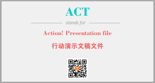 英文缩略词“ACT”经常作为“Action! Presentation file”的英文缩写来使用,中文表示:“行动演示文稿文件”。本文将详细介绍英文缩写词ACT所代表英文单词,其对应的中文拼音、详细解释以及在英语中的流行度。此外,还有关于缩略词ACT的分类、应用领域及相关应用示例等。