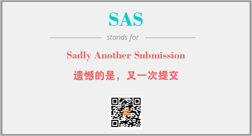 英文缩略词“SAS”经常作为“Sadly Another Submission”的英文缩写来使用,中文表示:“遗憾的是,又一次提交”。本文将详细介绍英文缩写词SAS所代表英文单词,其对应的中文拼音、详细解释以及在英语中的流行度。此外,还有关于缩略词SAS的分类、应用领域及相关应用示例等。