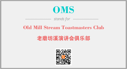 上述内容是“Old Mill Stream Toastmasters Club”作为“OMS”的缩写,解释为“老磨坊溪演讲会俱乐部”时的信息,以及英文缩略词OMS所代表的英文单词,其对应的中文拼音、详细解释以及在英文中的流行度和相关分类、应用领域及应用示例等。