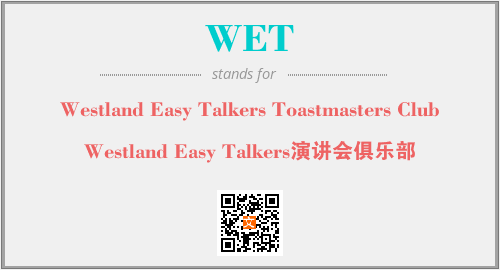 上述内容是“Westland Easy Talkers Toastmasters Club”作为“WET”的缩写,解释为“Westland Easy Talkers演讲会俱乐部”时的信息,以及英文缩略词WET所代表的英文单词,其对应的中文拼音、详细解释以及在英文中的流行度和相关分类、应用领域及应用示例等。