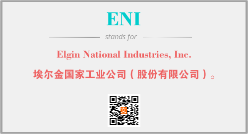 上述内容是“Elgin National Industries, Inc.”作为“ENI”的缩写,解释为“埃尔金国家工业公司(股份有限公司)。”时的信息,以及英文缩略词ENI所代表的英文单词,其对应的中文拼音、详细解释以及在英文中的流行度和相关分类、应用领域及应用示例等。