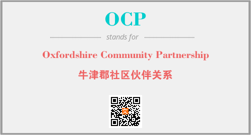 上述内容是“Oxfordshire Community Partnership”作为“OCP”的缩写,解释为“牛津郡社区伙伴关系”时的信息,以及英文缩略词OCP所代表的英文单词,其对应的中文拼音、详细解释以及在英文中的流行度和相关分类、应用领域及应用示例等。
