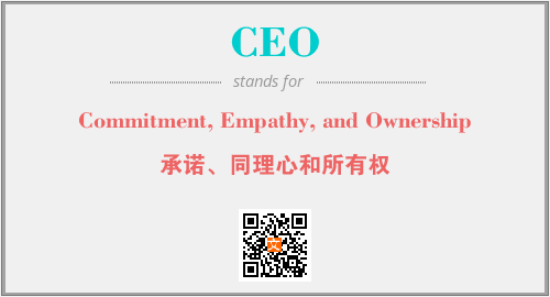 上述内容是“Commitment, Empathy, and Ownership”作为“CEO”的缩写,解释为“承诺、同理心和所有权”时的信息,以及英文缩略词CEO所代表的英文单词,其对应的中文拼音、详细解释以及在英文中的流行度和相关分类、应用领域及应用示例等。