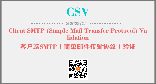 上述内容是“Client SMTP (Simple Mail Transfer Protocol) Validation”作为“CSV”的缩写,解释为“客户端SMTP(简单邮件传输协议)验证”时的信息,以及英文缩略词CSV所代表的英文单词,其对应的中文拼音、详细解释以及在英文中的流行度和相关分类、应用领域及应用示例等。