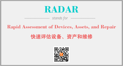 上述内容是“Rapid Assessment of Devices, Assets, and Repair”作为“RADAR”的缩写,解释为“快速评估设备、资产和维修”时的信息,以及英文缩略词RADAR所代表的英文单词,其对应的中文拼音、详细解释以及在英文中的流行度和相关分类、应用领域及应用示例等。