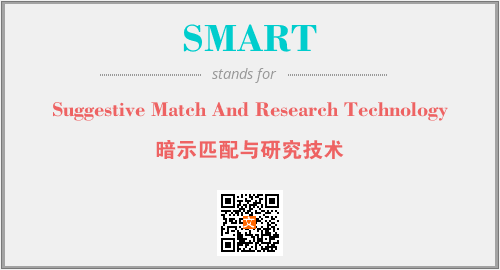 上述内容是“Suggestive Match And Research Technology”作为“SMART”的缩写,解释为“暗示匹配与研究技术”时的信息,以及英文缩略词SMART所代表的英文单词,其对应的中文拼音、详细解释以及在英文中的流行度和相关分类、应用领域及应用示例等。