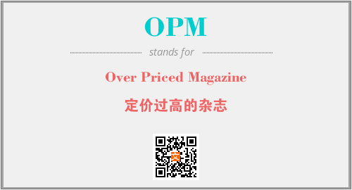 英文缩略词“OPM”经常作为“Over Priced Magazine”的英文缩写来使用,中文表示:“定价过高的杂志”。本文将详细介绍英文缩写词OPM所代表英文单词,其对应的中文拼音、详细解释以及在英语中的流行度。此外,还有关于缩略词OPM的分类、应用领域及相关应用示例等。