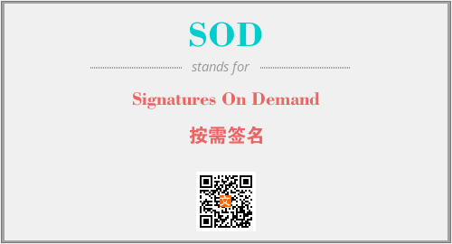 英文缩略词“SOD”经常作为“Signatures On Demand”的英文缩写来使用,中文表示:“按需签名”。本文将详细介绍英文缩写词SOD所代表英文单词,其对应的中文拼音、详细解释以及在英语中的流行度。此外,还有关于缩略词SOD的分类、应用领域及相关应用示例等。