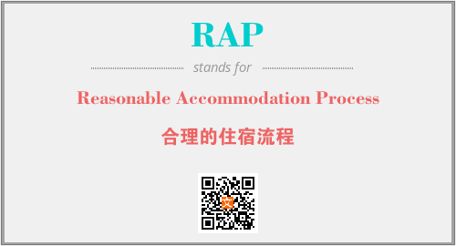 上述内容是“Reasonable Accommodation Process”作为“RAP”的缩写,解释为“合理的住宿流程”时的信息,以及英文缩略词RAP所代表的英文单词,其对应的中文拼音、详细解释以及在英文中的流行度和相关分类、应用领域及应用示例等。
