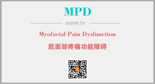 上述内容是“Myofacial Pain Dysfunction”作为“MPD”的缩写,解释为“肌面部疼痛功能障碍”时的信息,以及英文缩略词MPD所代表的英文单词,其对应的中文拼音、详细解释以及在英文中的流行度和相关分类、应用领域及应用示例等。