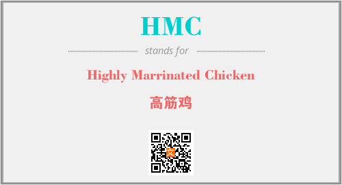 上述内容是“Highly Marrinated Chicken”作为“HMC”的缩写,解释为“高筋鸡”时的信息,以及英文缩略词HMC所代表的英文单词,其对应的中文拼音、详细解释以及在英文中的流行度和相关分类、应用领域及应用示例等。