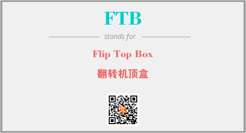 上述内容是“Flip Top Box”作为“FTB”的缩写,解释为“翻转机顶盒”时的信息,以及英文缩略词FTB所代表的英文单词,其对应的中文拼音、详细解释以及在英文中的流行度和相关分类、应用领域及应用示例等。
